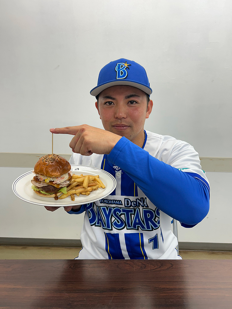 | 説 明 | 自家製の照り焼きソースで東選手の好物であるトンテキをイメージしたボリューム満点のハンバーガー! トッピングのコールスローがハンバーガーとの相性抜群と東選手が絶賛したハンバーガーをぜひご賞味ください! |
