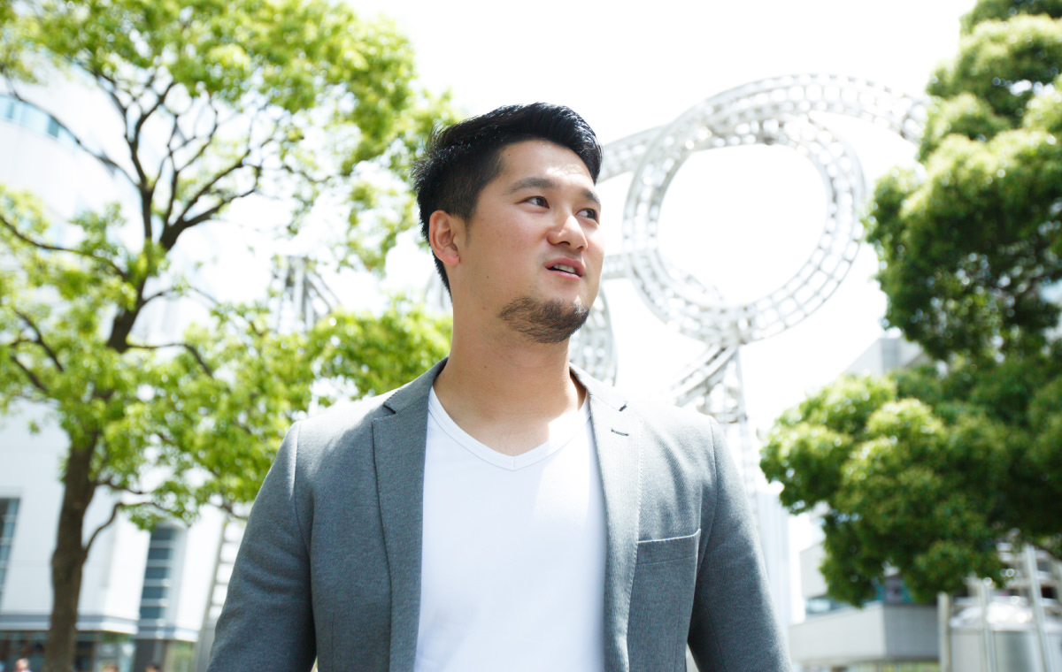 撮影の日は爽やかなグレーのジャケットで登場してくれた三上朋也選手。