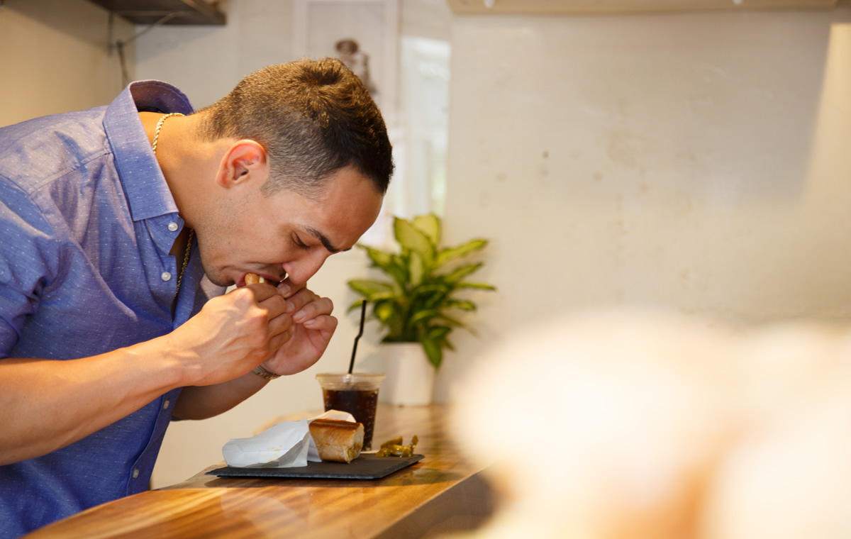 昼過ぎにサンドイッチショップに現れたソト選手は「これが今日の朝ごはんになるね」と用意された名物・キューバサンドをペロリ。