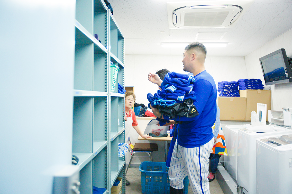「稲葉さーん!え!?取材ですか?」仕分けされた棚から洗いあがった衣類を抱えながら、選手たちは自然と笑顔になる。