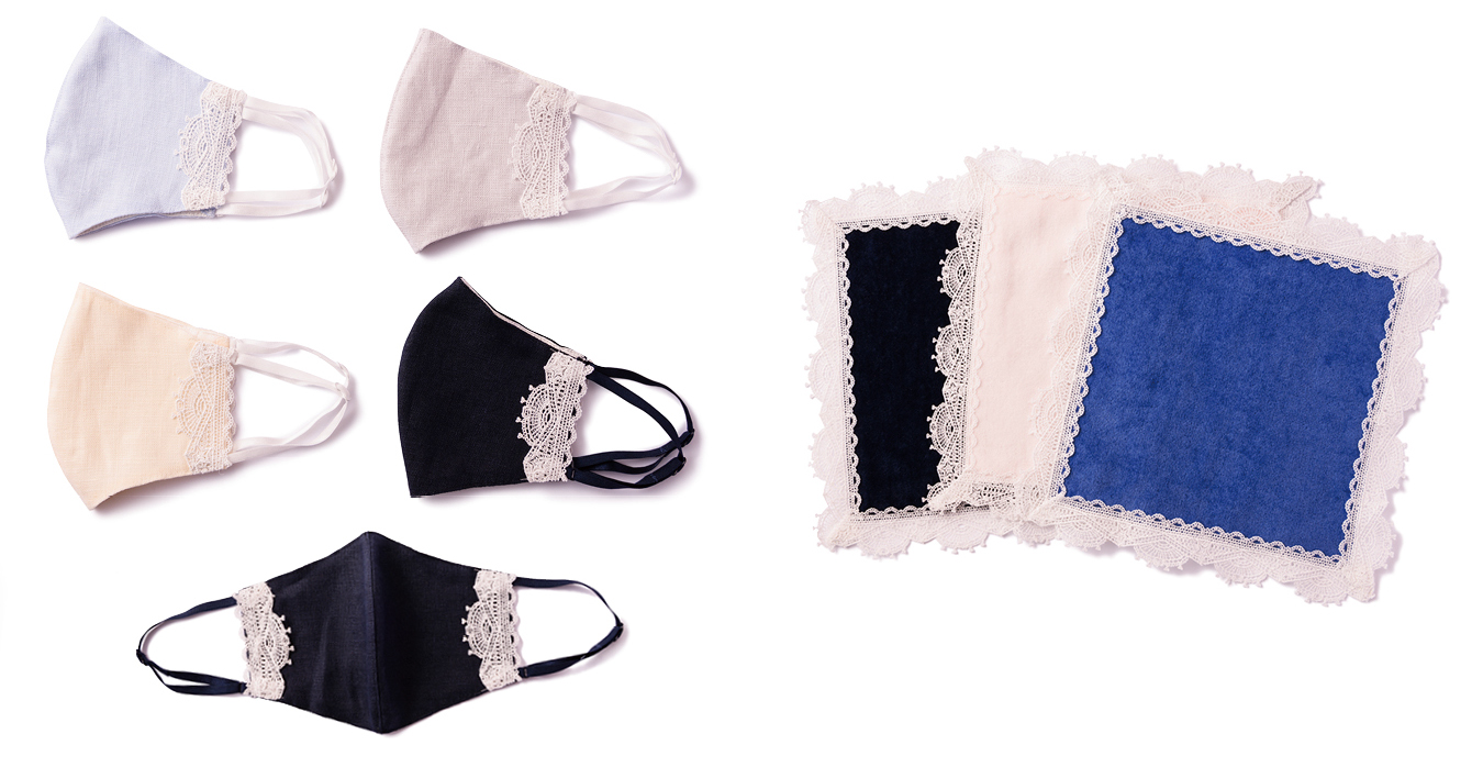 普段使いもバッチリ。レースマスク各¥2,300 タオルハンカチ各¥1,900