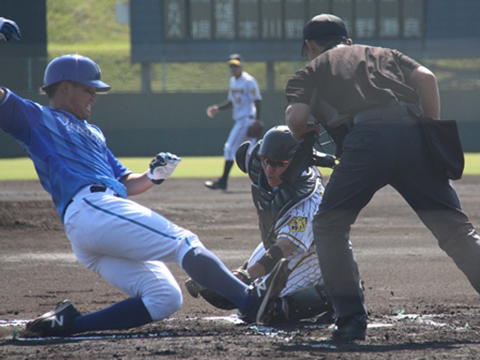 0対0の緊迫した試合のなか、8回表に戸柱選手のタイムリーで狩野選手が先制のホームイン。 |