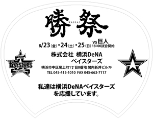 横浜DeNAベイスターズでは、8月23日(金)~25日(日)巨人戦で開催する夏の一大イベント「勝祭(KASSAI)」にて、「横浜DeNAベイスターズ 応援うちわ」を来場者にプレゼントします。その「応援うちわ」の小口協賛のお申込み受付けを本日より開始します。