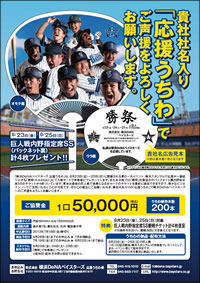 この「応援うちわ」は表面に選手がデザインされ、裏面にはお申込み貴社社名等が記載された完全オリジナルデザイン。こちらをお申込み1口(50,000円)に対し200本を制作します。200本のうち100本は貴社に納品し、残り100本は勝祭(KASSAI)にて来場者にプレゼント。貴社名入り応援うちわが来場者にプレゼントされることで、貴社のPRにもなります。