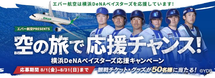 キャンペーン開始の8月1日以降出発分のエバー航空日本発の航空券をお持ちの方、またはキャンペーン期間中にエバー航空公式サイトより航空券をご購入された方の中から抽選で、横浜スタジアムで開催される横浜DeNAベイスターズ観戦ペアチケットや横浜DeNAベイスターズの選手のサイン入りグッズなどを総勢50名様にプレゼントいたします。