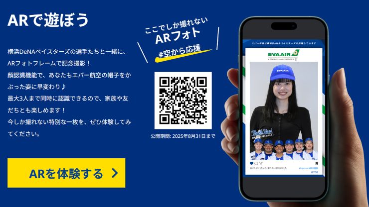 「エバー航空 PRESENTS 空の旅で応援チャンス 横浜DeNAベイスターズ応援キャンペーン」の期間中は、キャンペーンサイトより、横浜DeNAベイスターズの選手たちと一緒に記念撮影ができる、ARフォトフレームを楽しむことができます。ここでしか撮れない特別な一枚をぜひ体験してみてください。