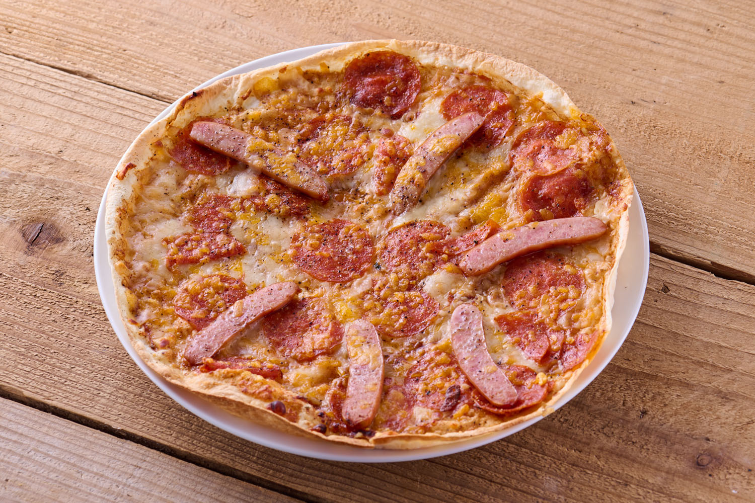 濃いめの味付けがクセになるBBQソースを塗ったさくさくトルティーヤ生地にチーズを乗せてペパロニ、ソーセージをふんだんにトッピング! 最後に振ったブラックペッパーのピリッとした辛味がアクセントとして楽しめます。 「アメリカで食べたピザより100倍おいしい」と筒香選手が絶賛した逸品! ぜひご賞味ください。 |