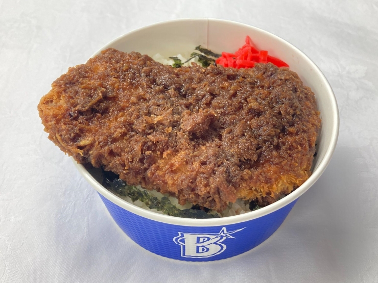 でっかいカツ丼ベイスターズが今年も登場! 紅ショウガとのりがトッピングされた選手盛りサイズのごはんの上に、オリジナルソースをくぐらせた器からはみ出るほどの大きさのカツが乗った一品です。 |