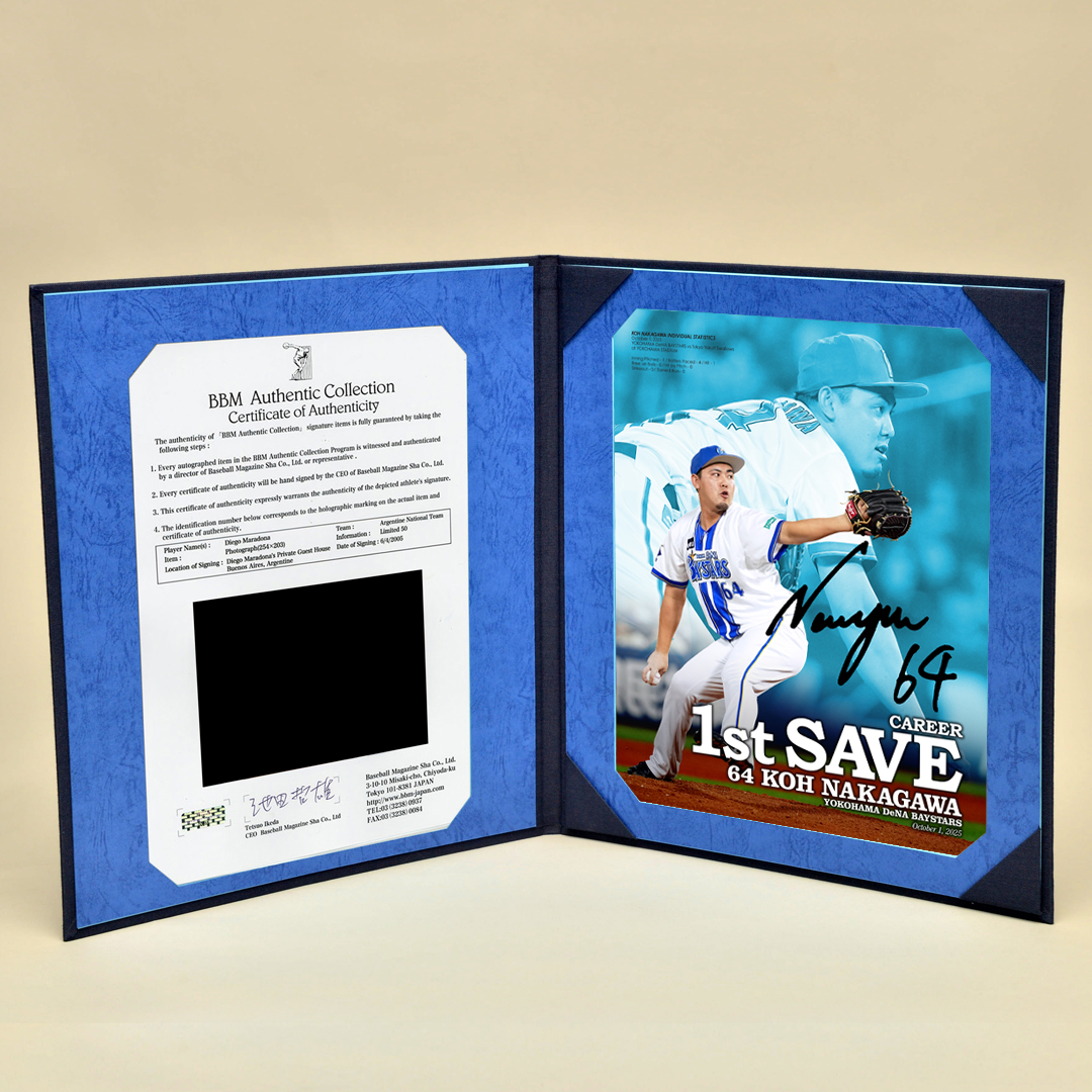 10月1日(水)東京ヤクルトスワローズ戦、横浜スタジアムにて中川虎大選手がプロ入り初セーブを記録したことを記念し、当日の試合写真をコラージュしたデザインのフォトファイルと初セーブ試合の成績を印したロゴボールに直筆サインを入れてお届けします。