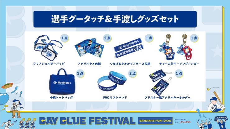 11月23日(祝・日)に開催される『横浜DeNAベイスターズ BAY BLUE FESTIVAL ~ BAYSTARS FUN! DAYS ~ Supported by ありあけハーバー』にて、BlueMatesメンバー限定「選手グータッチ&手渡しグッズセット」参加券を抽選申込専用サイトにて発売いたします。