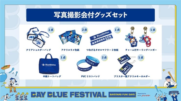 11月23日(祝・日)に開催される『横浜DeNAベイスターズ BAY BLUE FESTIVAL 〜 BAYSTARS FUN! DAYS 〜 Supported by ありあけハーバー』にて、BlueMates限定イベント選手写真撮影会の参加権利と限定グッズが封入された「写真撮影会付グッズセット」参加券を抽選申込専用サイトにて発売いたします。