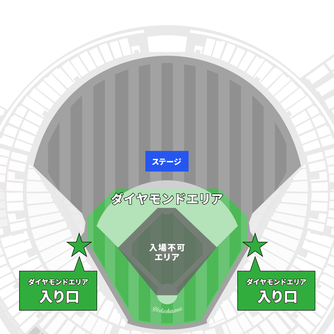 また、本イベントではグラウンドからメインイベントをご観覧いただける「ダイヤモンドエリア」を、スタンドへの入場券をお持ちのお客様全員へ開放いたします。詳細は下記よりご確認ください。