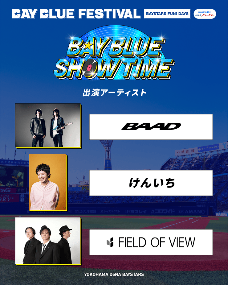 『横浜DeNAベイスターズ BAY BLUE FESTIVAL ~ BAYSTARS FUN! DAYS ~ Supported by ありあけハーバー』DAY1の締めとなる音楽ライブ「BAY BLUE SHOW TIME」にBAADさん、けんいちさん、FIELD OF VIEWさんの来場が決定!