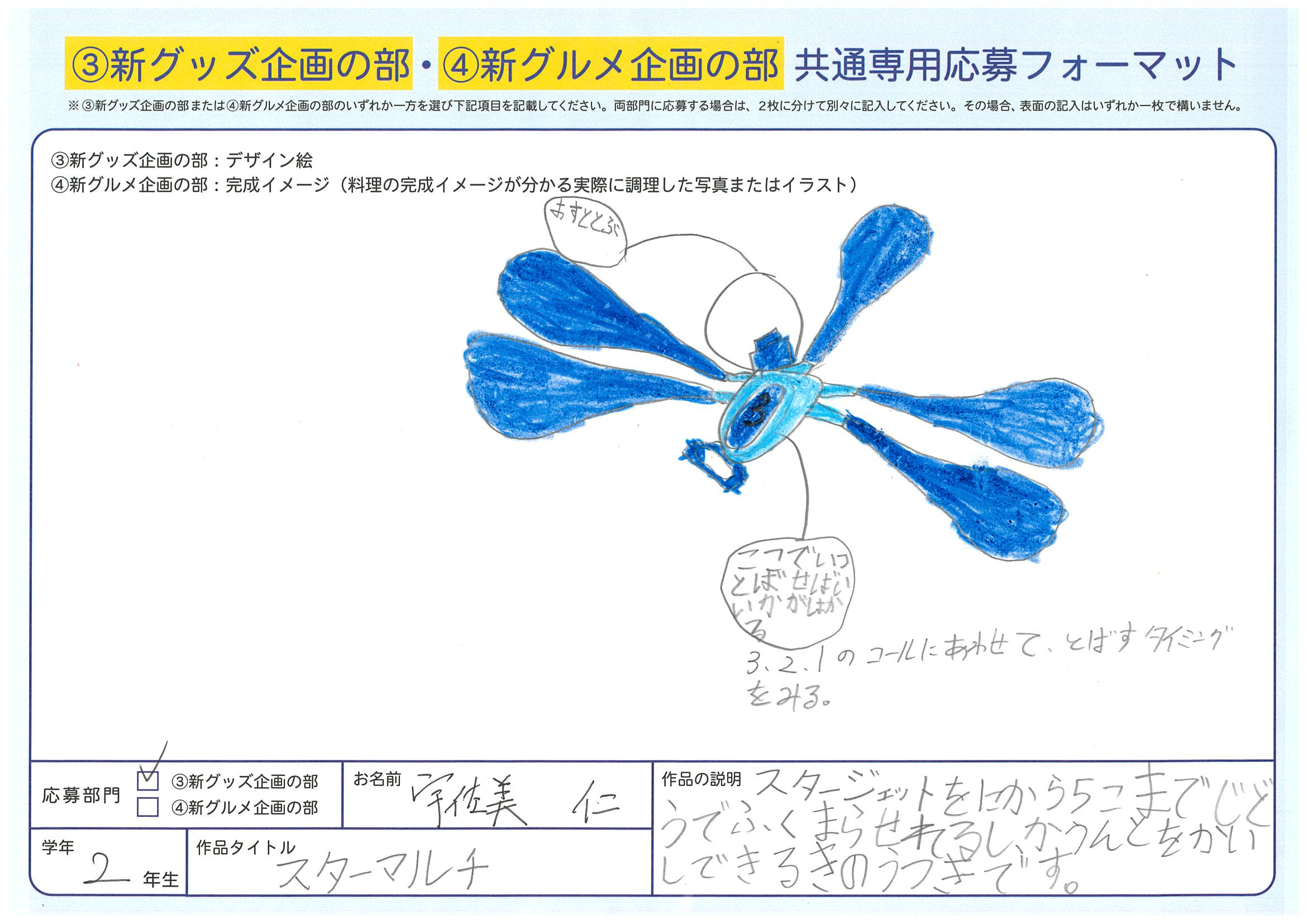 ◎東誠人さん(3年生) <審査員コメント> 具体的に、かつ、たくさんのアイデアをありがとうございました。特に、イスのアイデアは子どもならではの目線で、なるほど!と思いました。 |