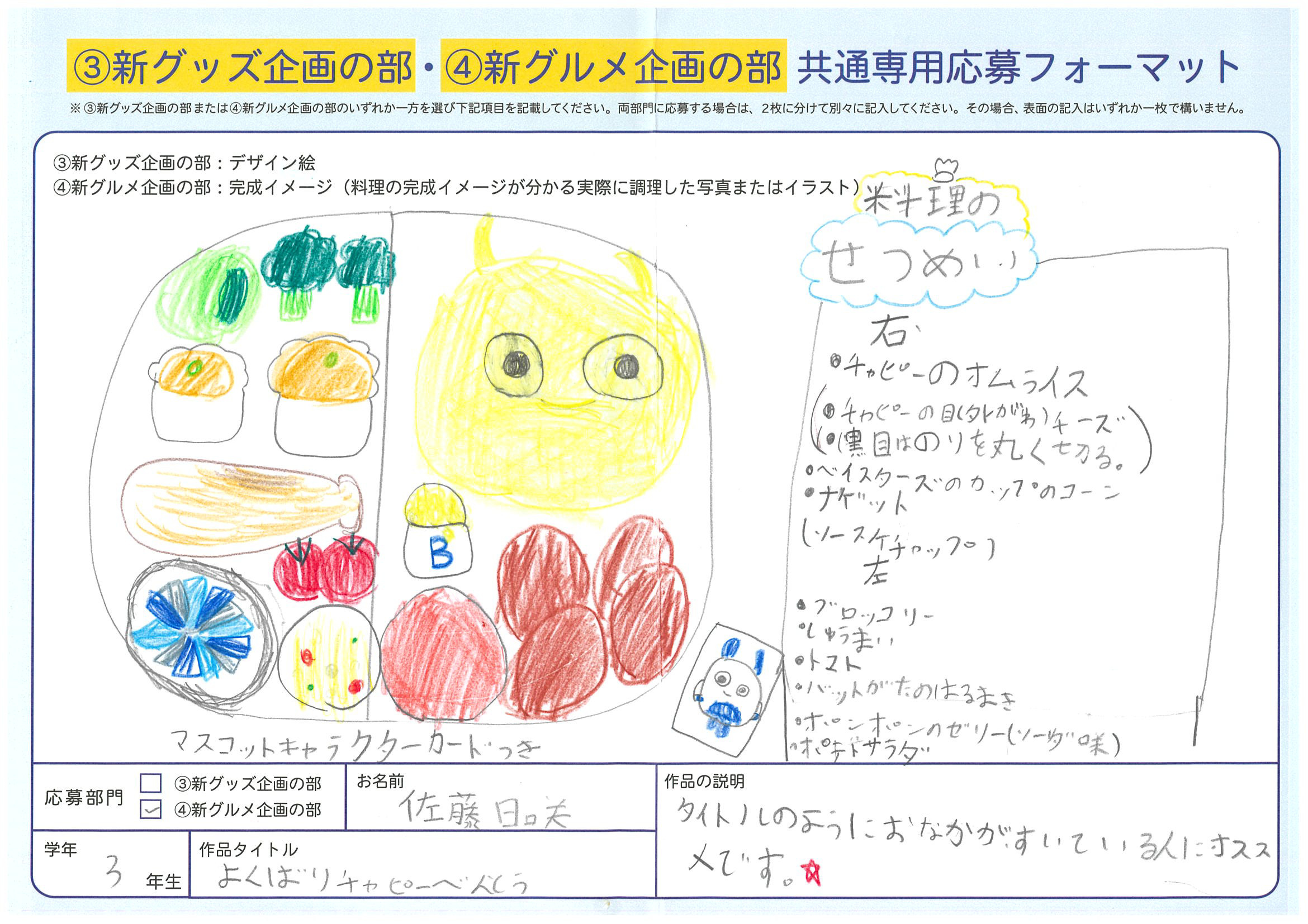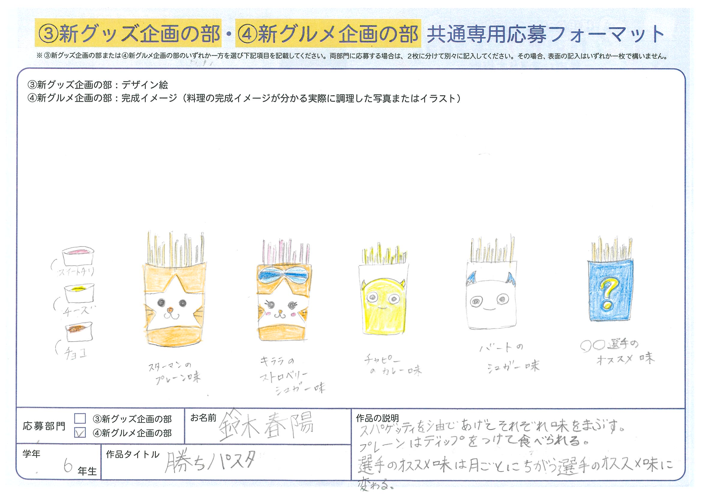 <審査員コメント> キャラクターの特徴をふまえたバラエティ感と選手の好みも入れており選べる楽しさや来るたびに楽しさを提供できる点が良い。商品の特徴的にも様々な選手に展開できるのもお客様に喜んで頂くことが期待できる。 |