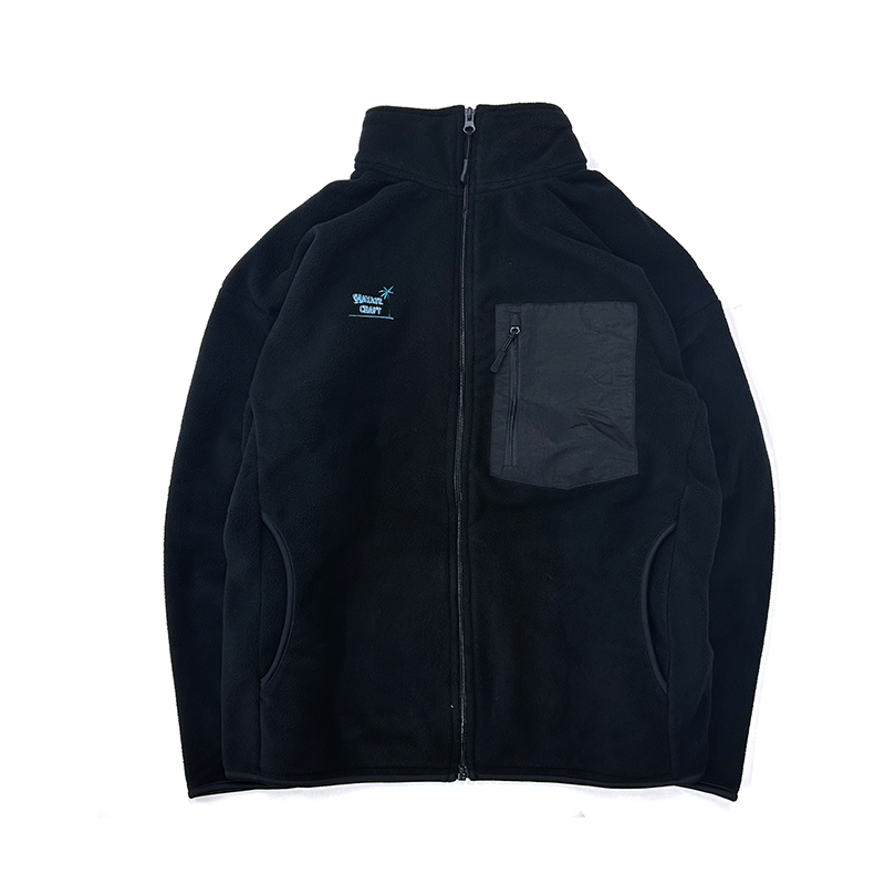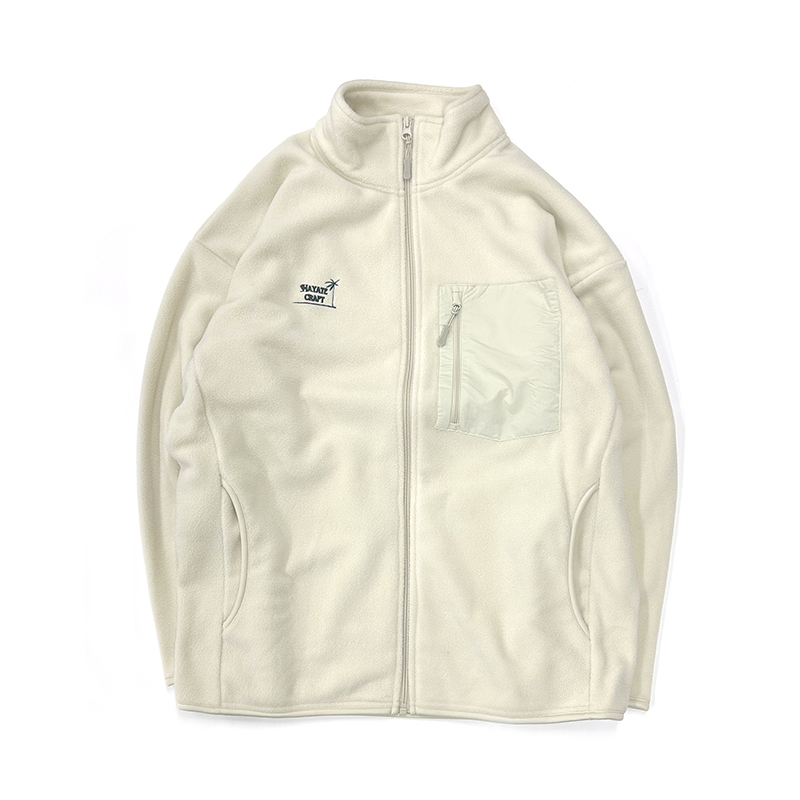 本人がセレクトしたジップジャケットは軽量ながら暖かさもあるマイクロフリース生地を使い、右胸にロゴマークを刺繍。