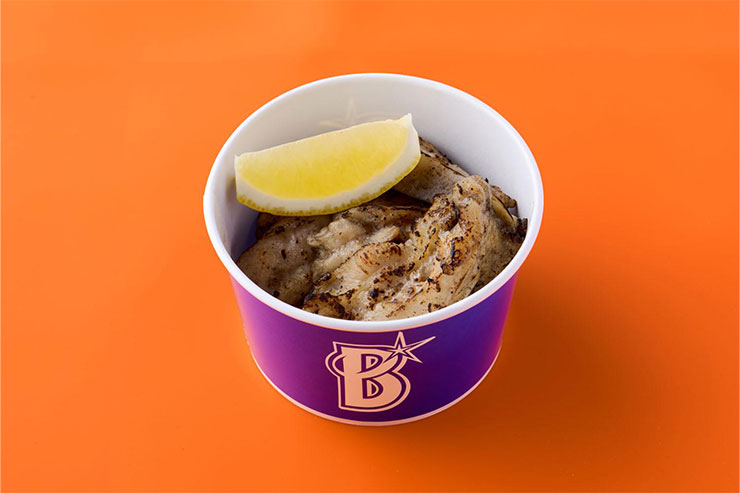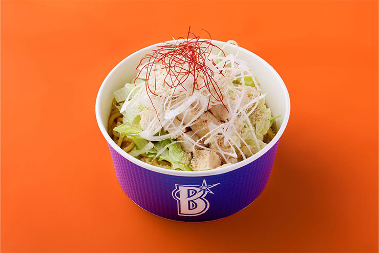 定番のベイカラに、桑原将志選手お気に入りのトッピング、チリソースをかけて新たな逸品! 辛いものが苦手な方でも食べやすいようスイートチリソースとマヨネーズを合わせマイルドな辛さに仕上げています。 |