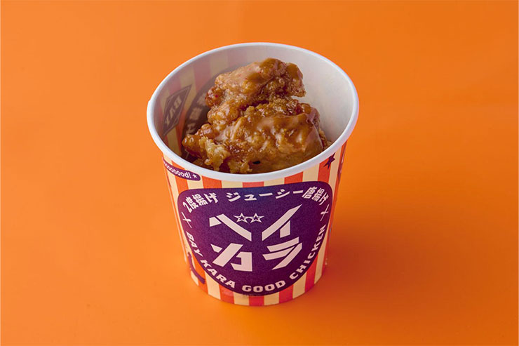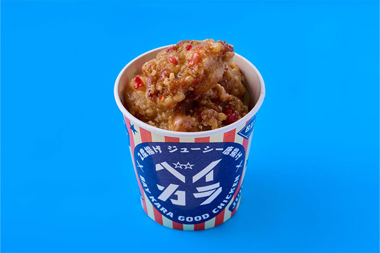 | 特 徴 | 『人気のベイカラに、僕の好きな照りマヨに七味でポイントを入れた、クセになるソースをトッピング!今まで食べた唐揚げで一番美味しいよ!』by入江大生選手 |