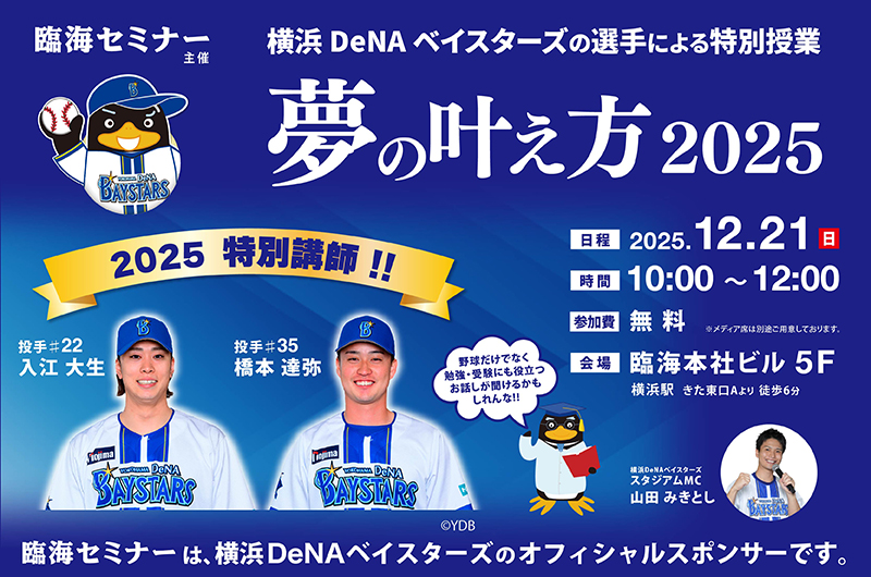 2025/11/2012月21日(日)に横浜DeNAべイスターズの選手による特別授業を『臨海セミナー主催 横浜DeNAベイスターズの選手による特別授業「夢の叶え方2025」』と題し、子どもたちを対象に開催いたします。