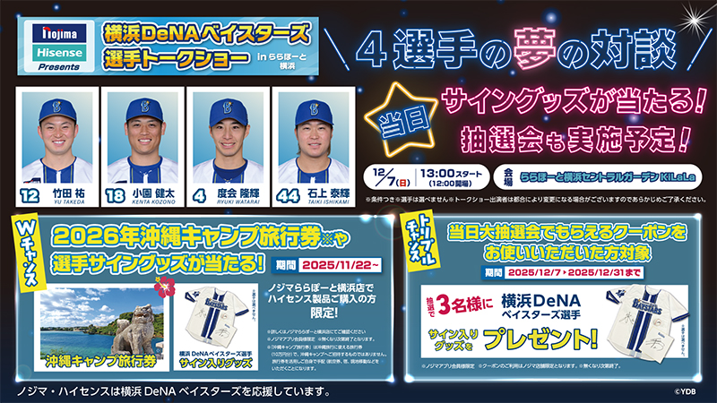 ユニフォームスポンサーであるノジマ&ハイセンスの共催により、いよいよ今週末、12月7日(日)にららぽーと横浜セントラルガーデンKiLaLaにて横浜DeNAベイスターズの選手4名をお迎えし、トークショー&大抽選会を実施いたします!