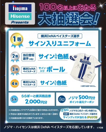 Wチャンスとして、ノジマららぽーと横浜店でハイセンス商品をご購入いただくと沖縄キャンプ旅行券やサイングッズが当たるキャンペーンも実施いたします。