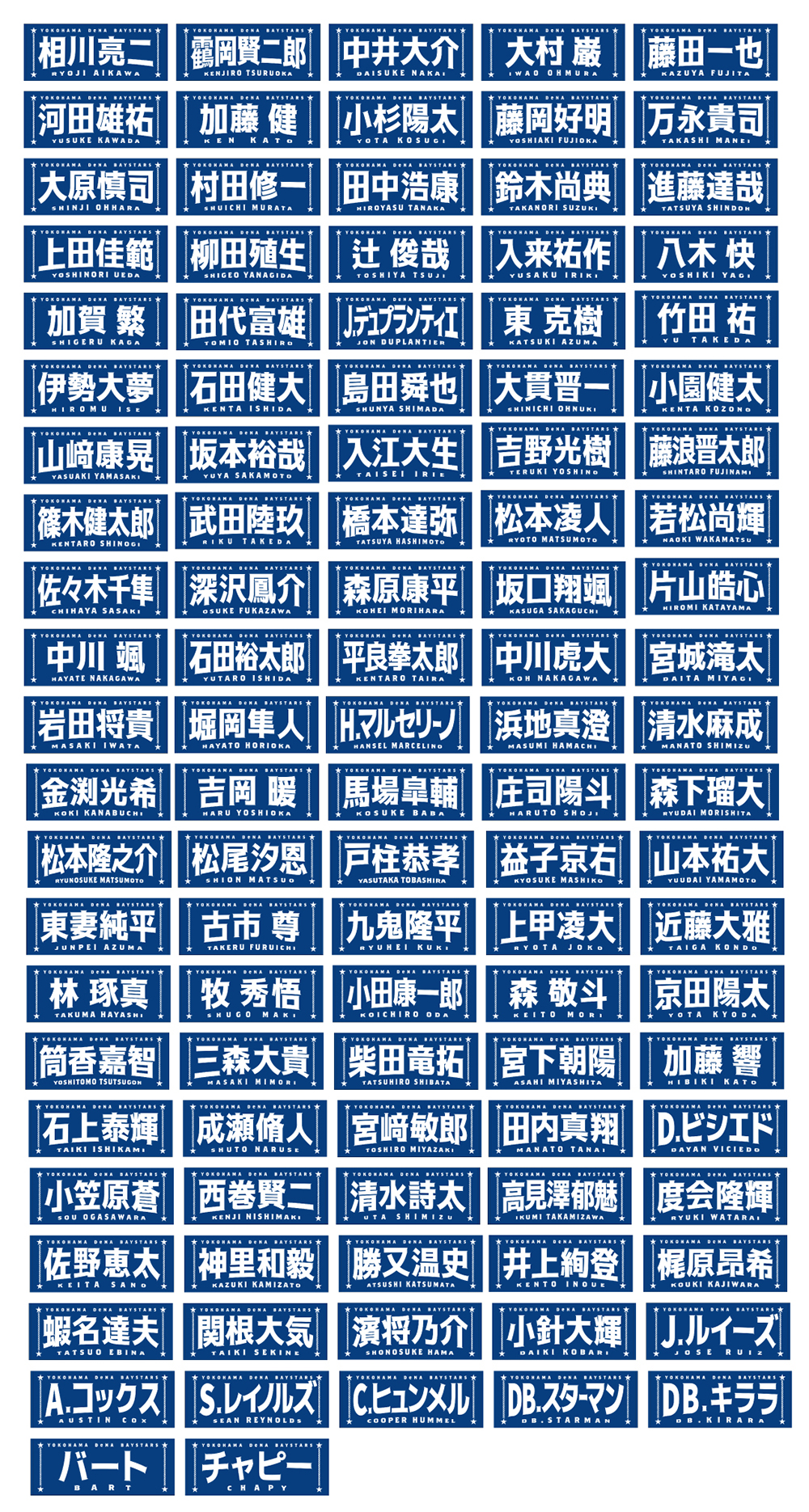 今回のデザインは名前に曲線をつけることで躍動感を演出し、よりエキサイティングに盛り上がる試合の雰囲気を文字で表現しました。両サイドには港町横浜からイメージするロープや星をあしらい、シンプルな中にもベイスターズらしさのあるポイントを追加しています。