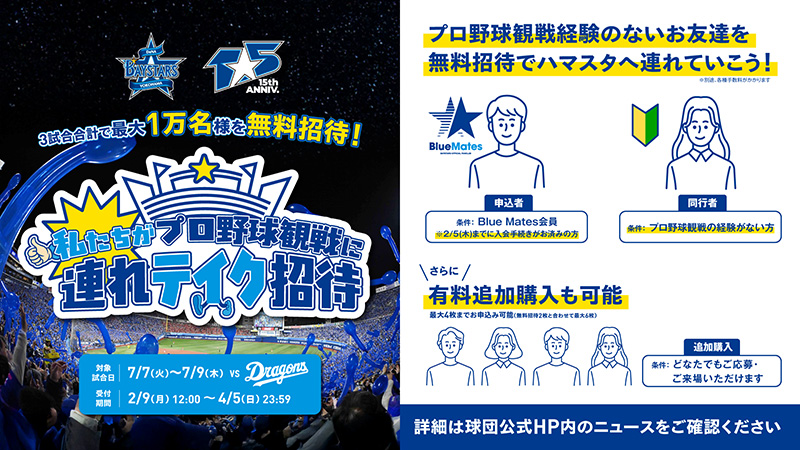『野球未来創造SERIES ~横浜DeNAベイスターズ 15th ANNIVERSARY GAME~』にて、対象3試合合計で最大1万名様を無料でご招待する「私たちがプロ野球観戦に連れテイク招待」を実施いたします。