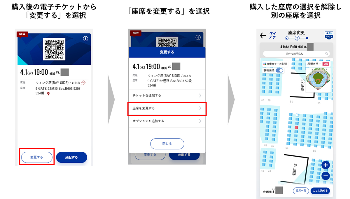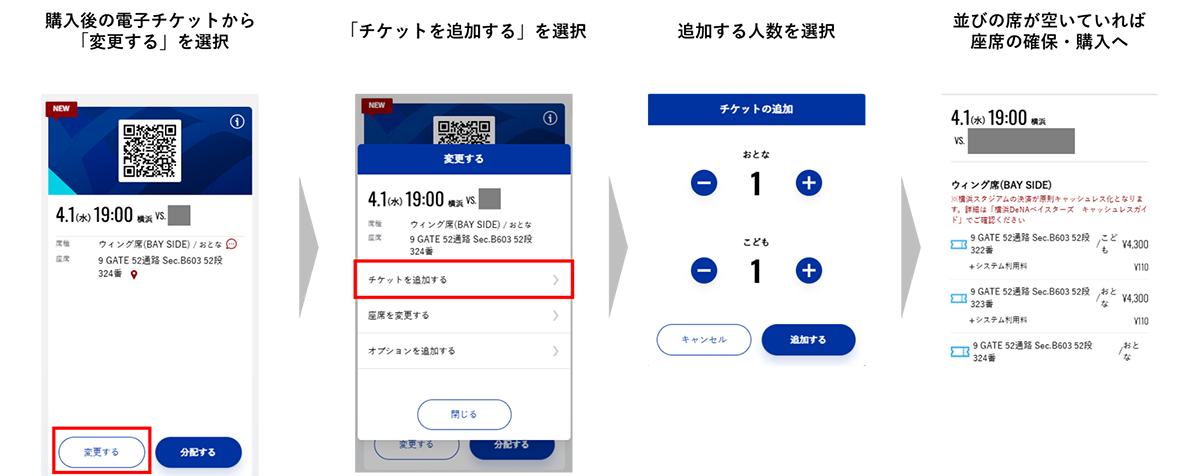 ご一緒に観戦されるお客様が増えた場合など、チケット購入後に座席を追加いただくことが可能となります。