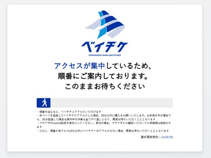 アクセスが集中する際には、オンラインの「待合室」にて「ベイチケ」への入場をお待ちいただけます。