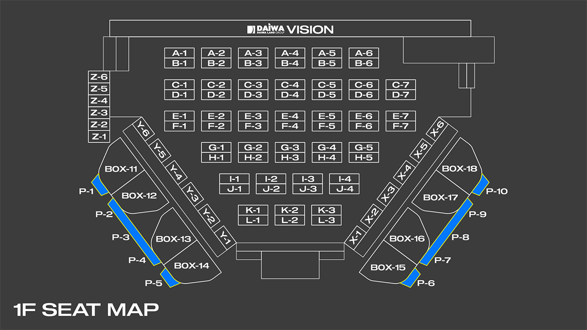 青くペイントされたエリアが立ち見エリアになります。