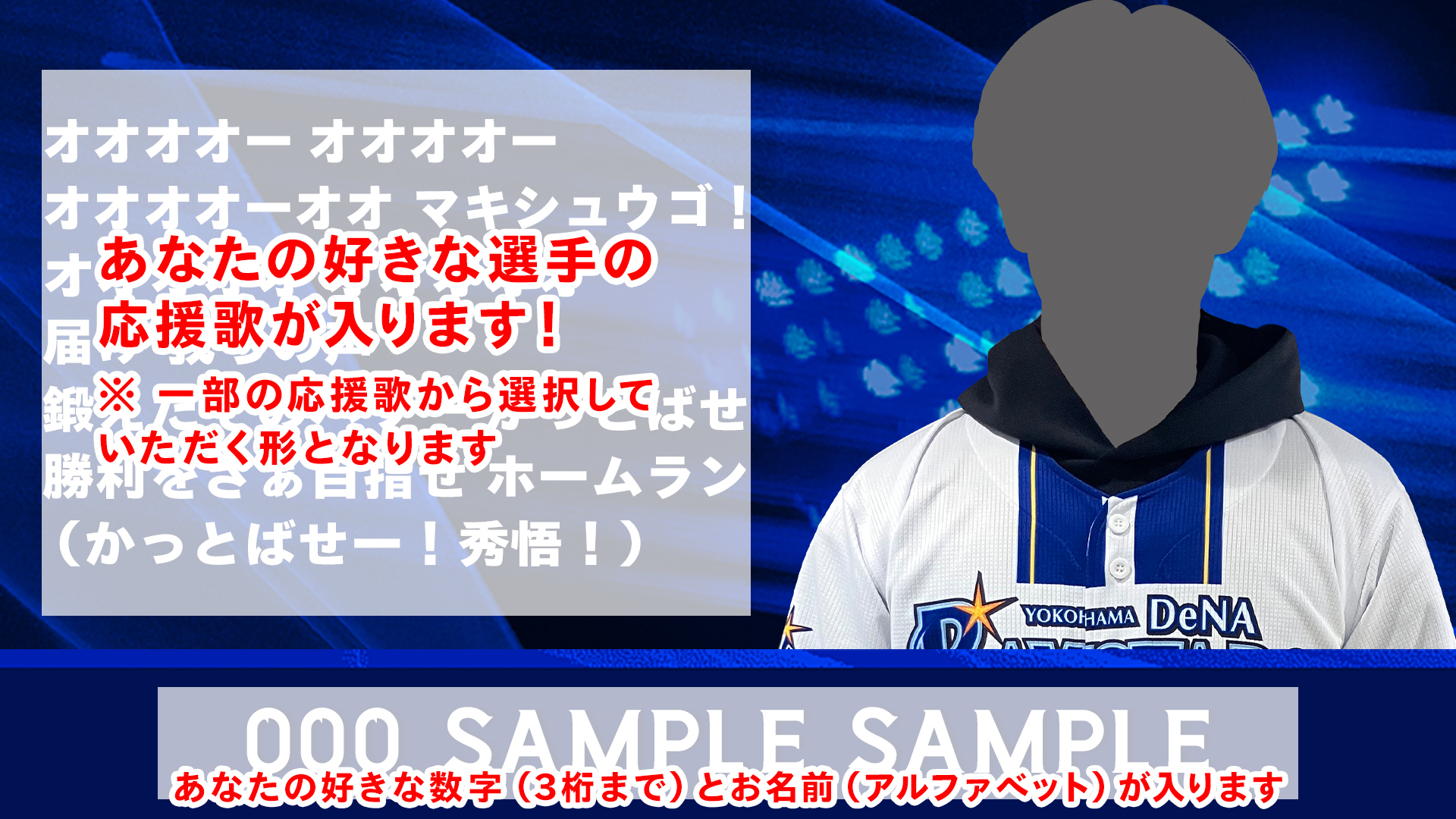 あなたの写真以外にも、ご自身のフルネームや3桁までの好きな数字、好きな選手の応援歌を入れ込むことが可能です。