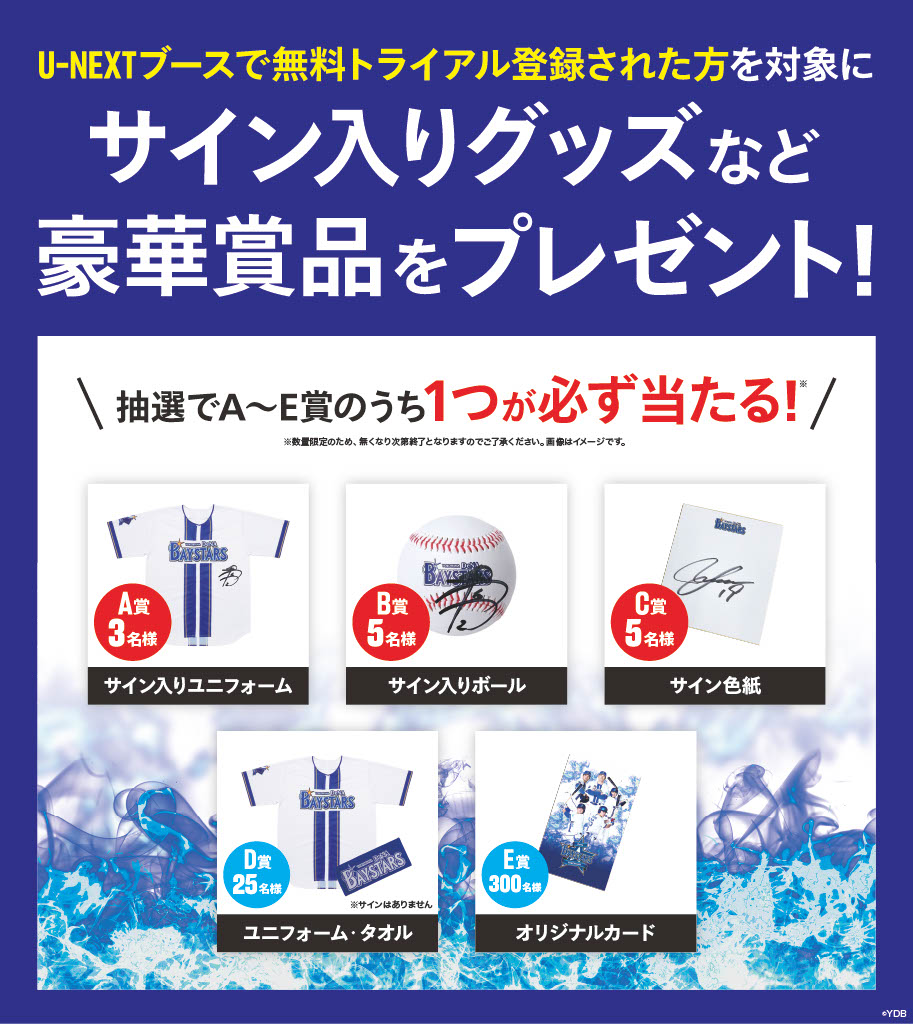 当日には会場の横浜スタジアムに、U-NEXTブースを出展いたします。U-NEXTの無料トライアル登録をしていただいた方を対象に、先着で限定オリジナルカードをプレゼント!さらに、抽選で選手のサイン入りグッズが当たるキャンペーンを実施いたします。