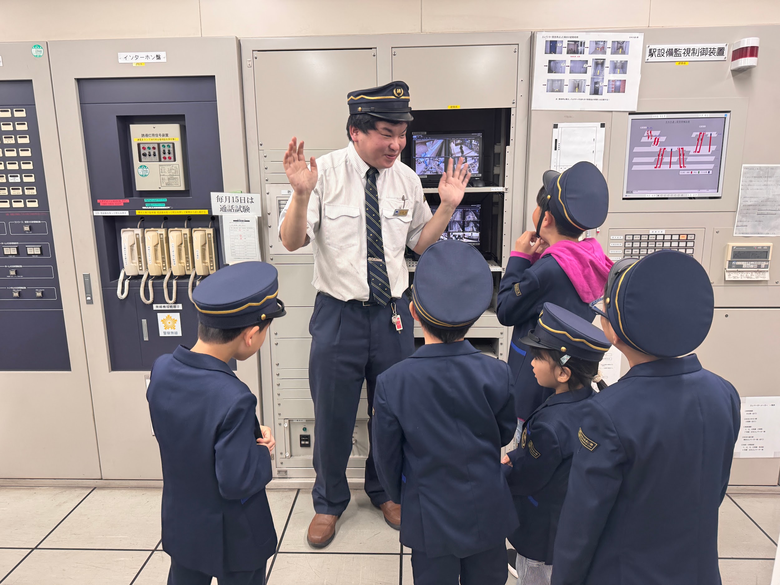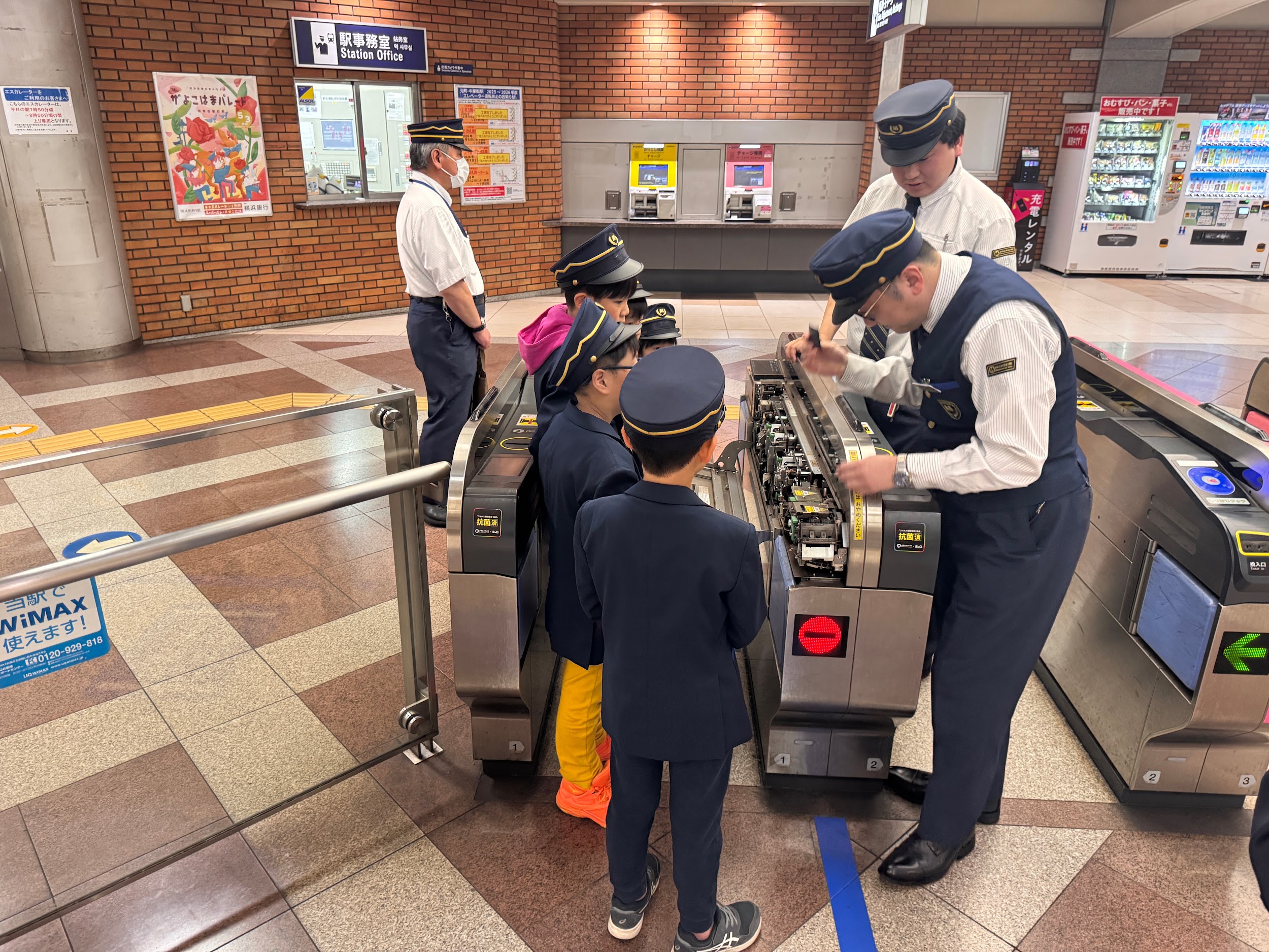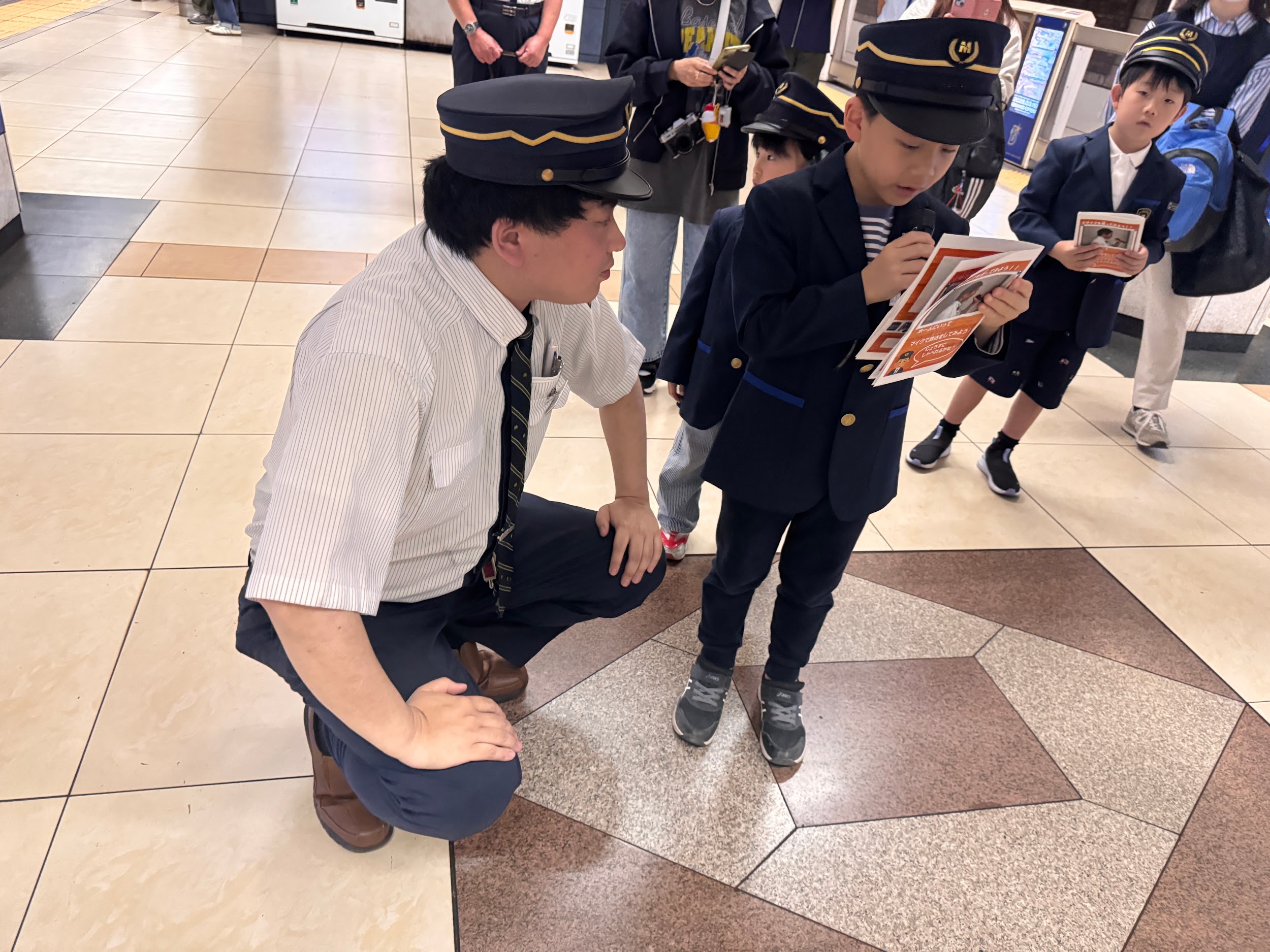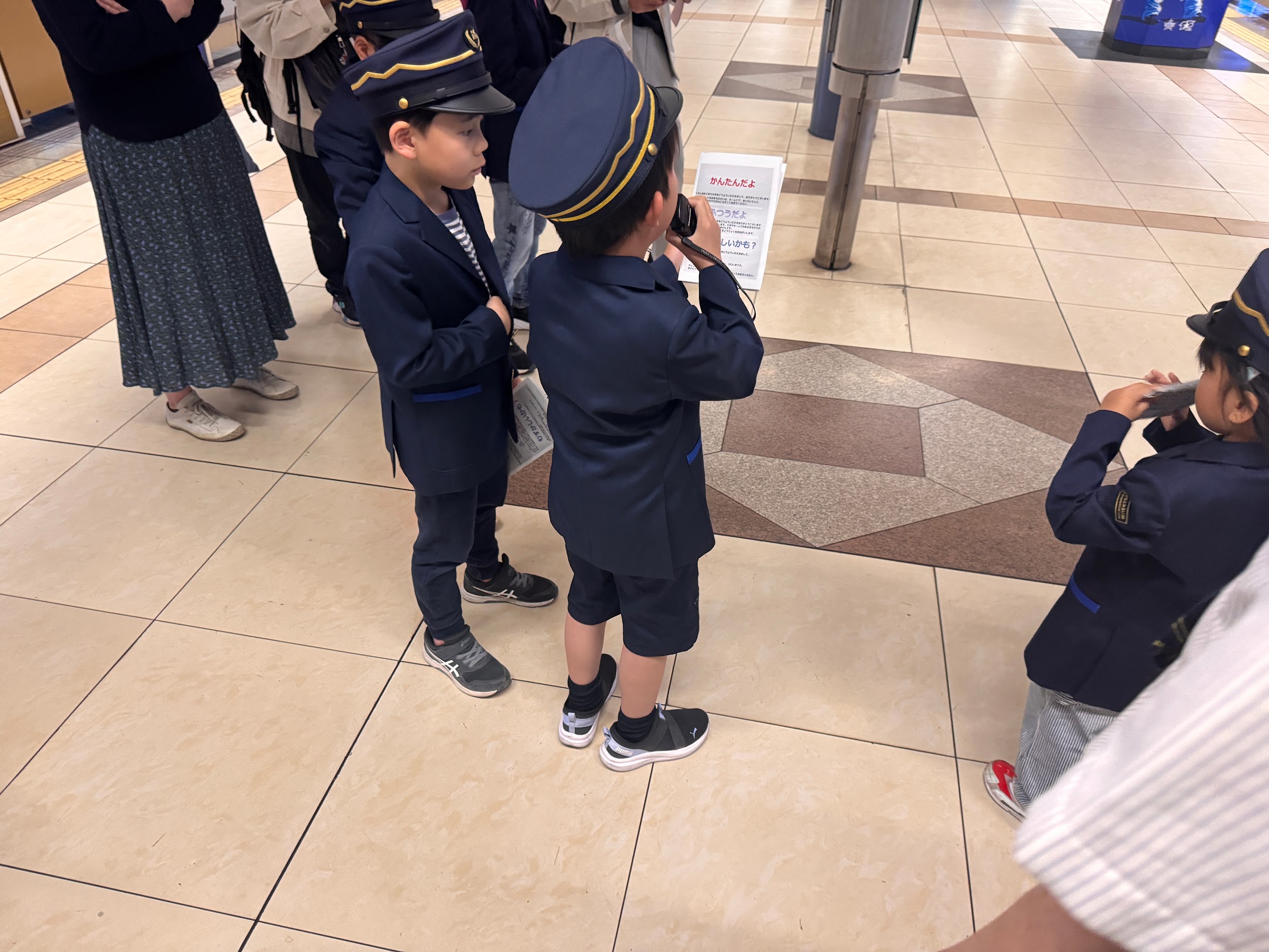 緊張しながらも、駅員さんの指導のもと、一言一言心を込めて安全を呼びかけました。ホームに響き渡る自分の声に、こどもたちは少し照れながらも誇らしげな表情を浮かべていました。