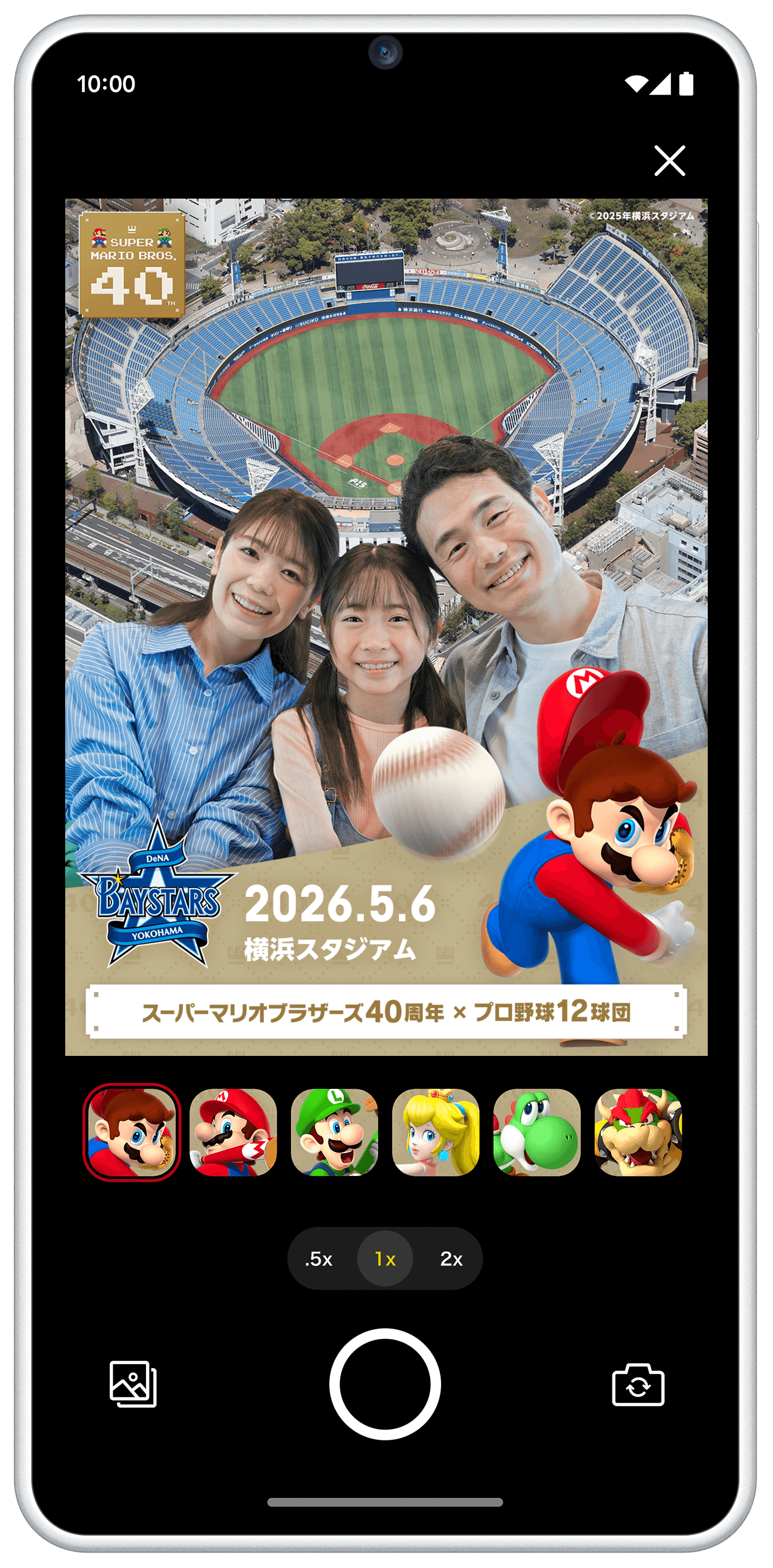 スマートフォン向けアプリ「Nintendo Today!」では、対象試合の当日・球場限定で、マリオたちと一緒に記念撮影ができる特別なフォトフレームを配信!