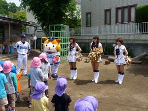 今回の訪問は天気に恵まれ、気持ちよく園庭での教室開催!奈良保育園のお友達は、元気いっぱいにスターマンと一緒にダンスをしたり、野球を体験したり…ステキな笑顔を見せてくれました☆その笑顔に、訪問した先生たちも元気なパワーをもらい、楽しい一日となりました♪