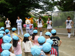 今回は幼稚園訪問ということでお友達の数が多いため、スタッフも多めでおじゃましました!スターマンはたくさんのお友達に囲まれ、とっても嬉しそうに遊んでいました♪ダンスも野球も、キラキラした瞳で楽しんで体験してくれた美しの森幼稚園のお友達!ありがとうございました☆彡