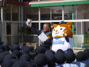 そして、もえぎ野幼稚園でもスターマンは大人気でした☆野球ふれあい教室が終わった後も、スターマンの姿を探してくれているお友達がいらしたそうです。このお話を聞いてスターマンも大喜び。スターマンは横浜スタジアムにいるので、是非会いに来てくださいね♪