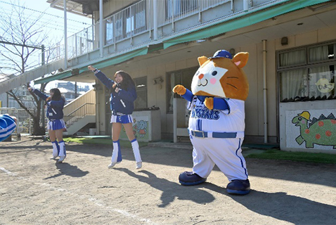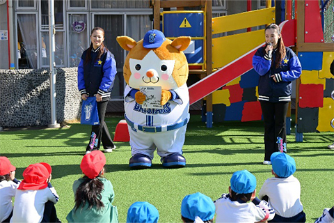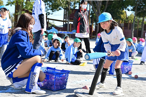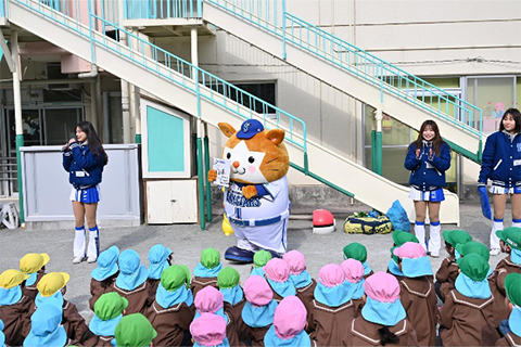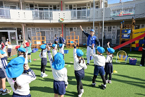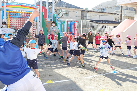 幼稚園や保育園は、小さな子供たちにボール遊びを経験していただき、野球に興味を持ってもらおうと企画しております。柔らかいボールを使った「捕る・投げる・打つ」の野球体験で元気いっぱいに身体を動かしました。