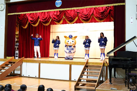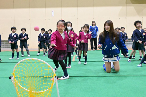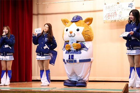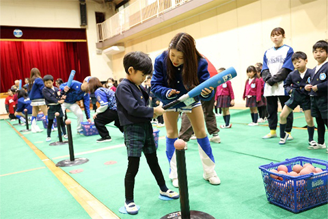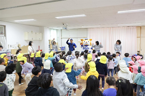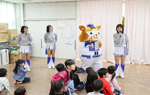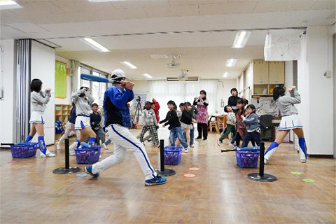 幼稚園や保育園は、小さな子供たちにボール遊びを経験していただき、野球に興味を持ってもらおうと企画しております。柔らかいボールを使った「捕る・投げる・打つ」のボール遊び以外にも横浜DeNAベイスターズオフィシャルマスコットのDB.スターマンや、オフィシャルパフォーマンスチームdiana(ディアーナ)、チアスクールインストラクターと一緒に、音楽に合わせてダンスエクササイズも行われ、元気いっぱいに身体を動かしました。