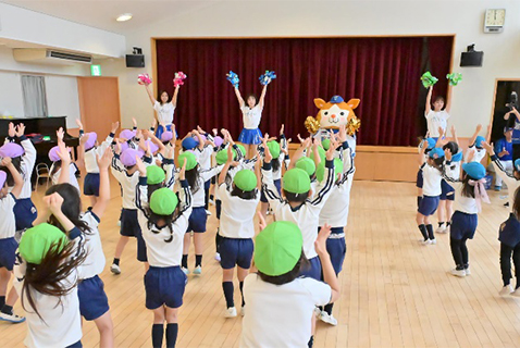 雨のために屋内での活動でしたが、DB.スターマンと一緒に楽しそうにダンスを踊る園児たちでした!