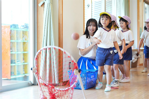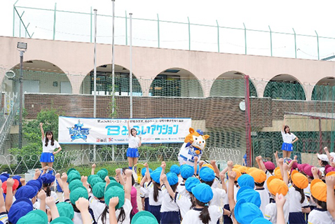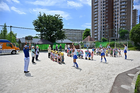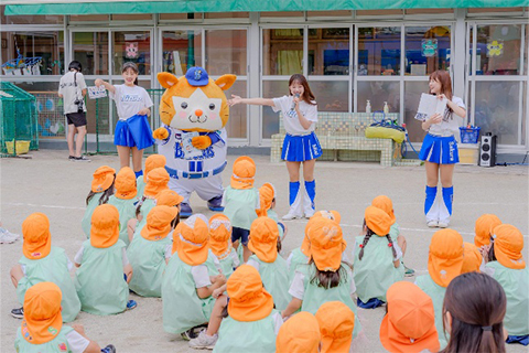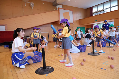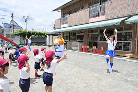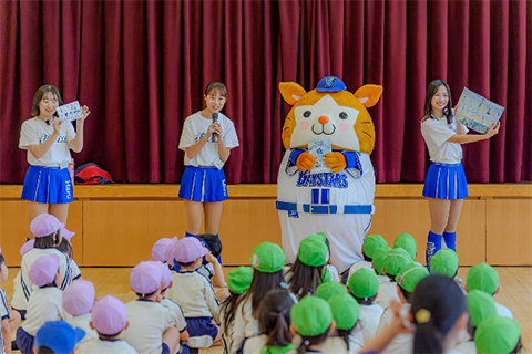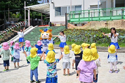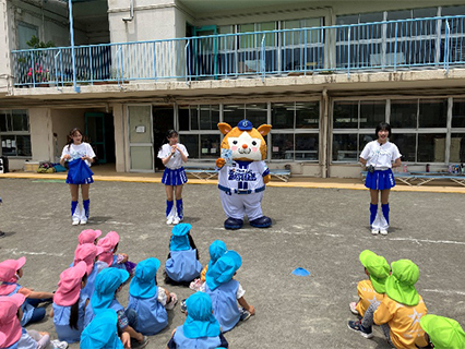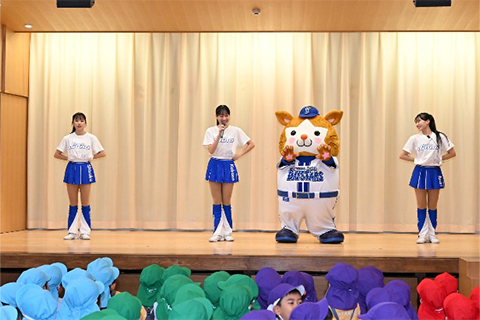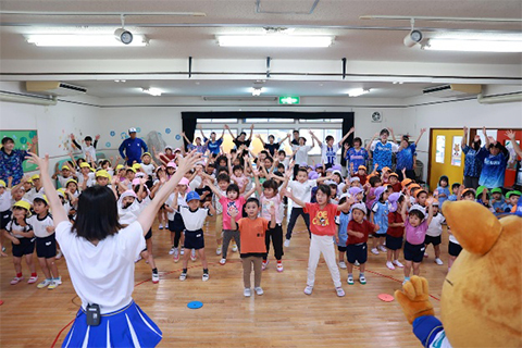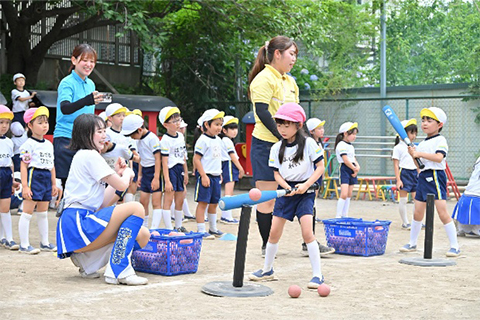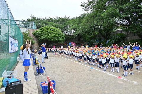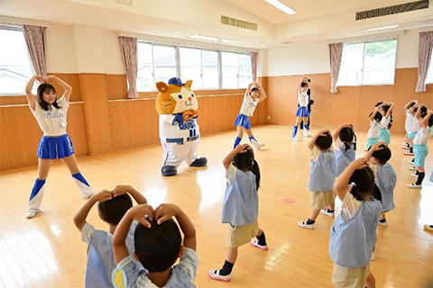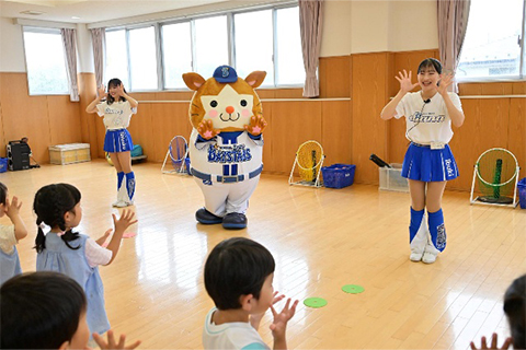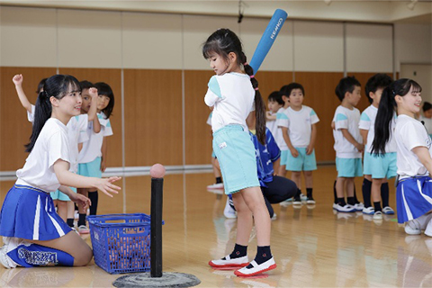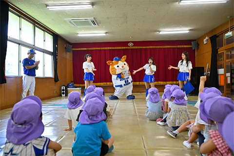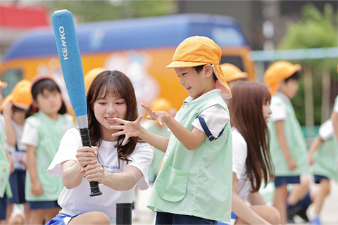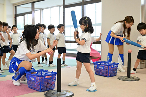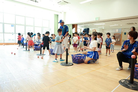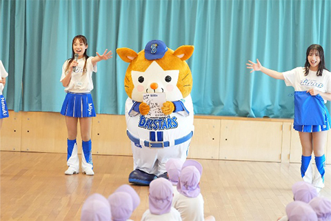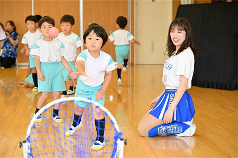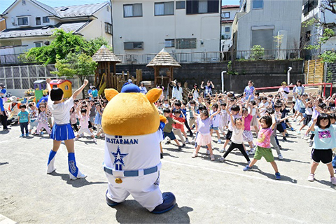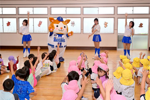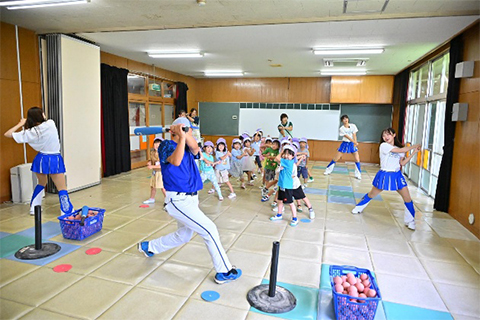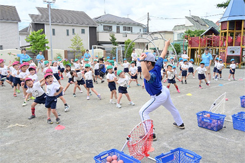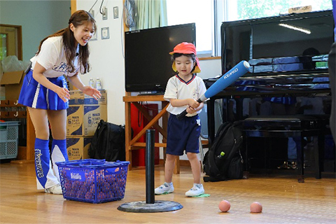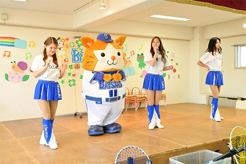幼稚園や保育園は、小さな子供たちにボール遊びを経験していただき、野球に興味を持ってもらおうと企画しております。柔らかいボールを使った「捕る・投げる・打つ」のボール遊び以外にも横浜DeNAベイスターズオフィシャルマスコットのDB.スターマンや、オフィシャルパフォーマンスチームdiana(ディアーナ)、チアスクールインストラクターと一緒に、音楽に合わせてダンスエクササイズも行われ、元気いっぱいに身体を動かしました。