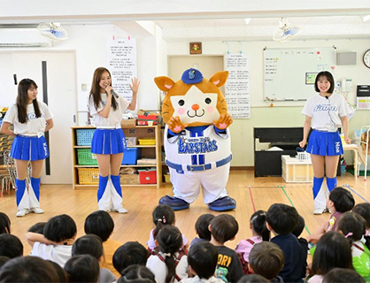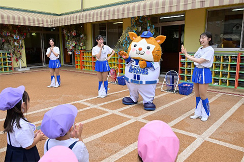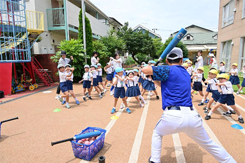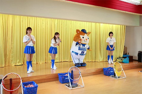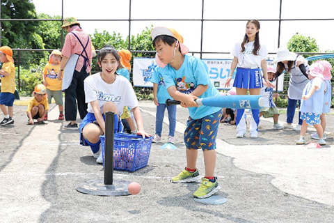 幼稚園や保育園は、小さな子供たちにボール遊びを経験していただき、野球に興味を持ってもらおうと企画しております。柔らかいボールを使った「捕る・投げる・打つ」のボール遊び以外にも横浜DeNAベイスターズオフィシャルマスコットのDB.スターマンや、オフィシャルパフォーマンスチームdiana(ディアーナ)、チアスクールインストラクターと一緒に、音楽に合わせてダンスエクササイズも行われ、元気いっぱいに身体を動かしました。