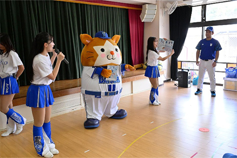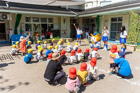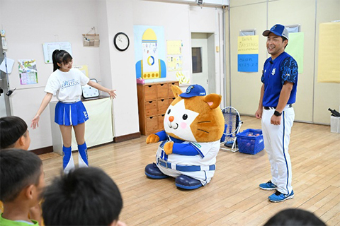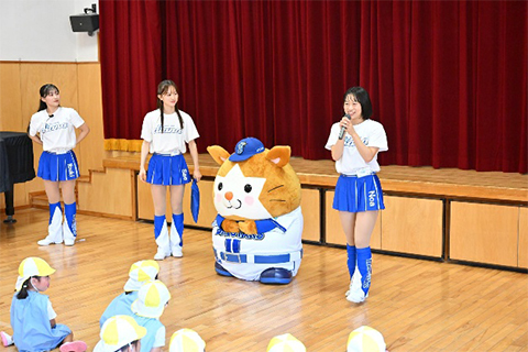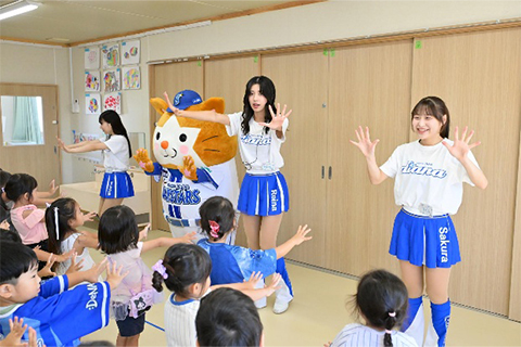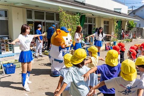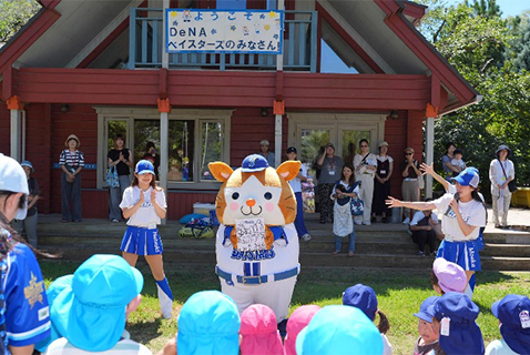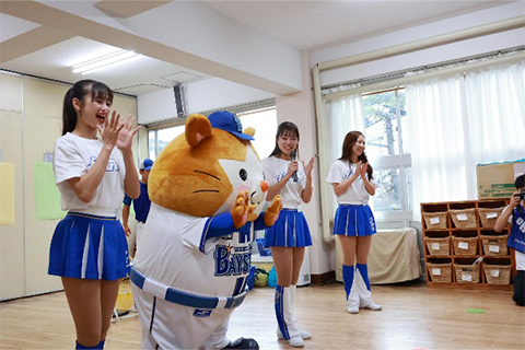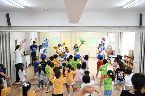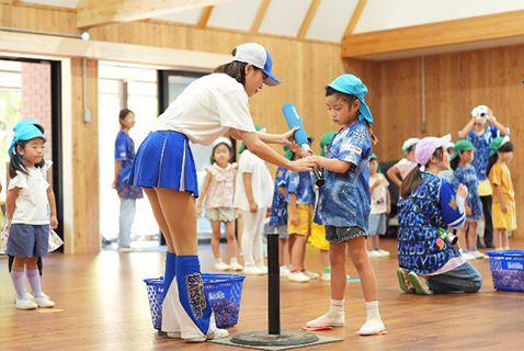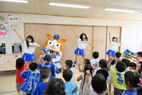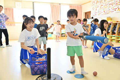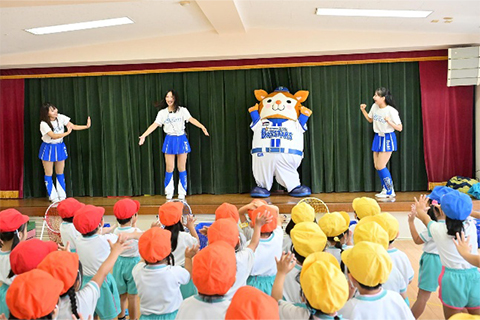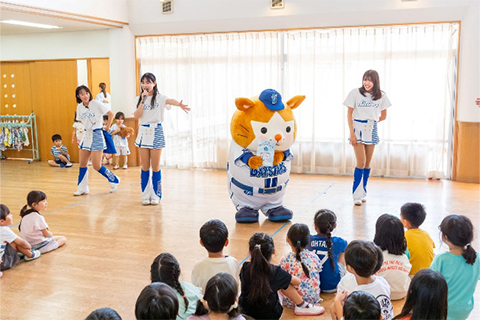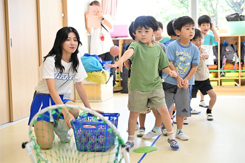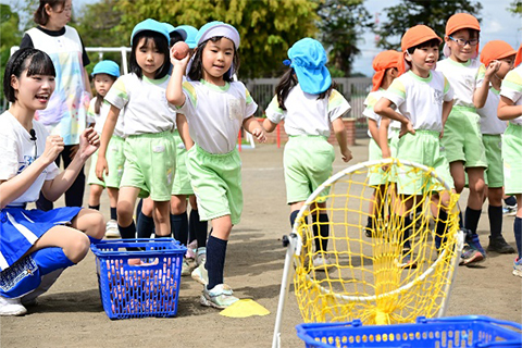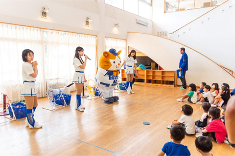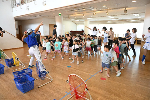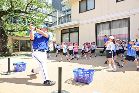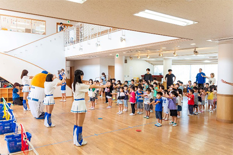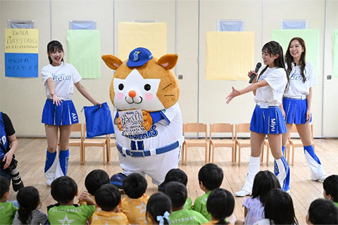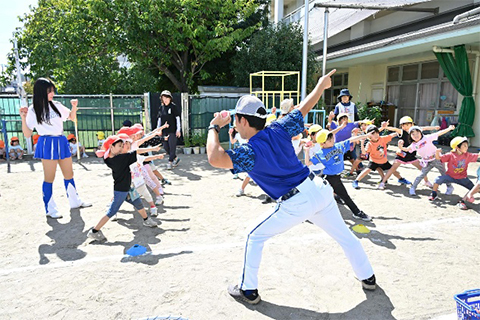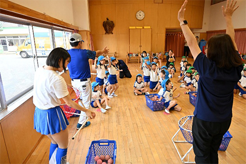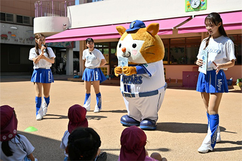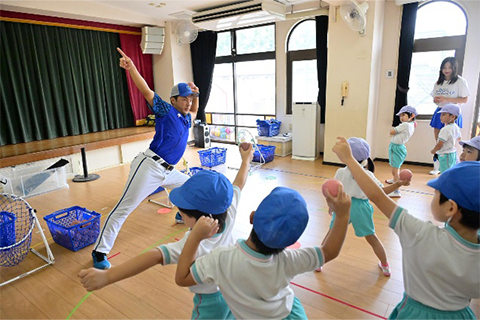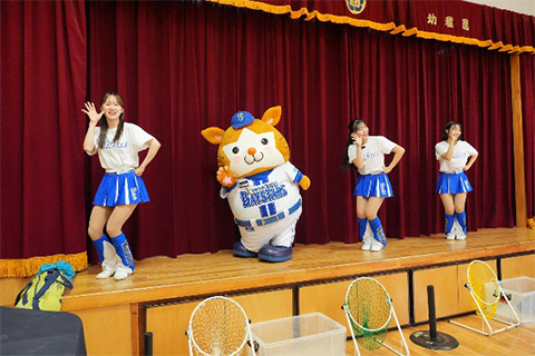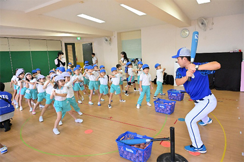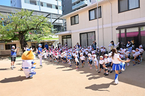 幼稚園や保育園は、小さな子供たちにボール遊びを経験していただき、野球に興味を持ってもらおうと企画しております。柔らかいボールを使った「捕る・投げる・打つ」のボール遊び以外にも横浜DeNAベイスターズオフィシャルマスコットのDB.スターマンや、オフィシャルパフォーマンスチームdiana(ディアーナ)、チアスクールインストラクターと一緒に、音楽に合わせてダンスエクササイズも行われ、元気いっぱいに身体を動かしました。
