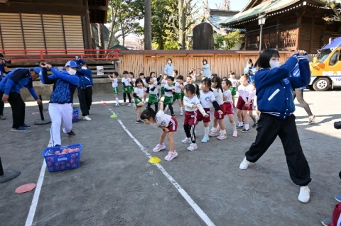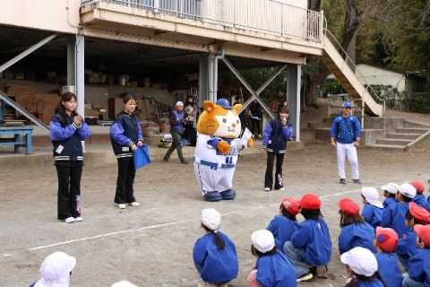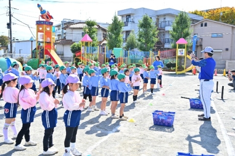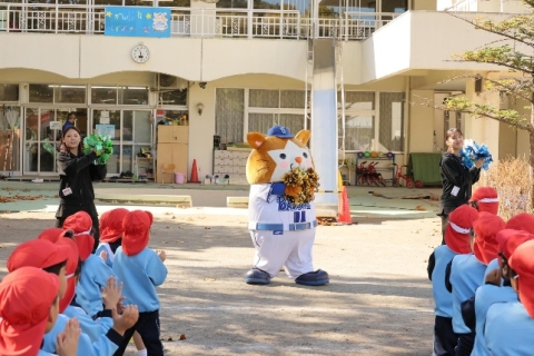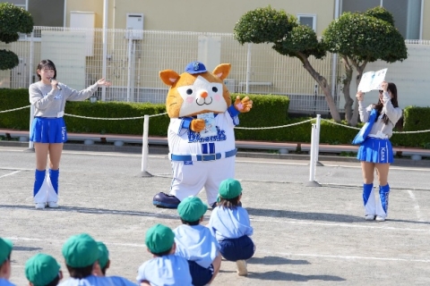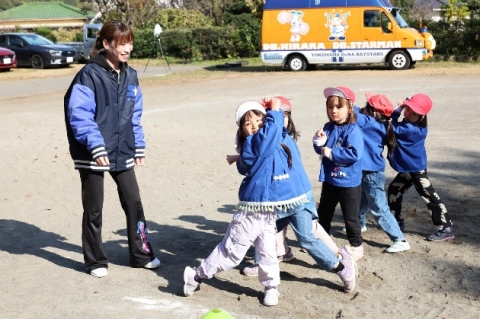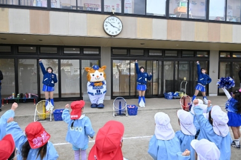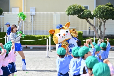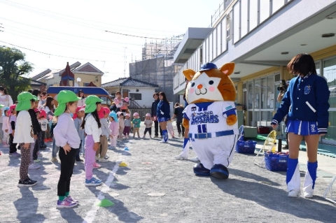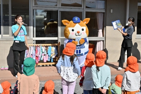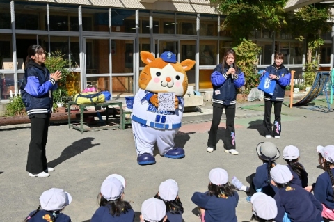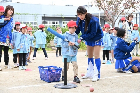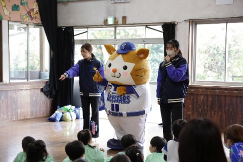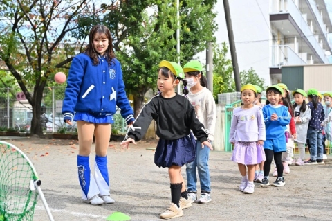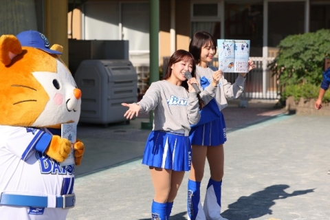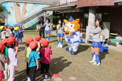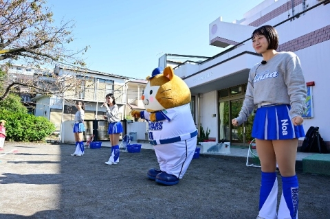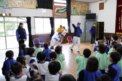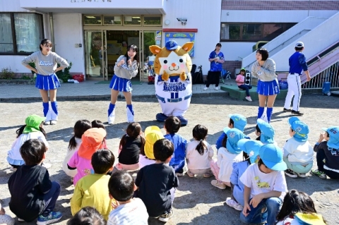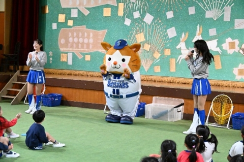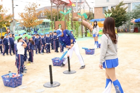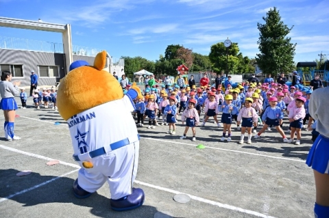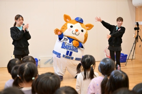 幼稚園や保育園は、小さなこどもたちにボール遊びを経験していただき、野球に興味を持ってもらおうと企画しております。柔らかいボールを使った「捕る・投げる・打つ」のボール遊び以外にもDeNAベイスターズオフィシャルマスコットのDB.スターマンや、オフィシャルパフォーマンスチームdiana(ディアーナ)、チアスクールインストラクターと一緒に、音楽に合わせてダンスエクササイズも行われ、元気いっぱいに身体を動かしました。