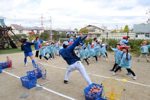 「投げる!」野球体験では、ゲームで盛り上がる園児たちでした!