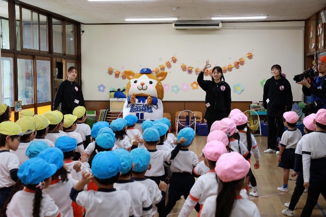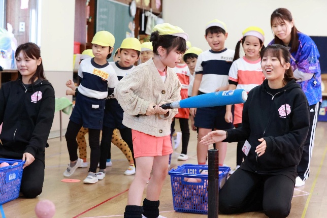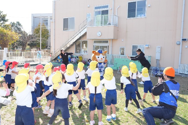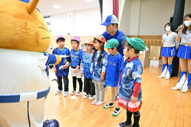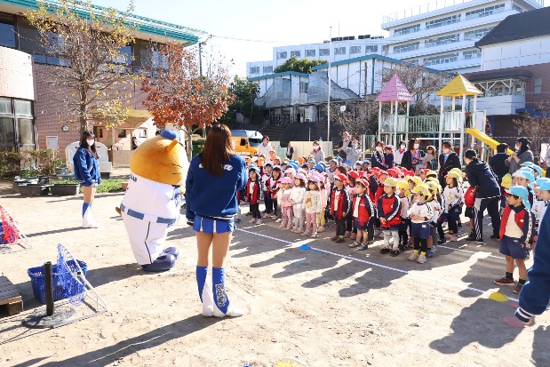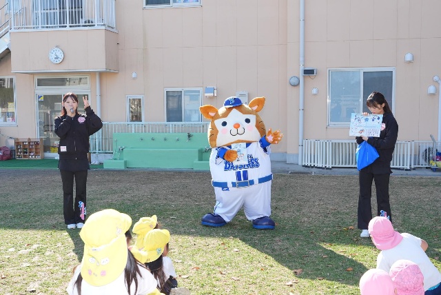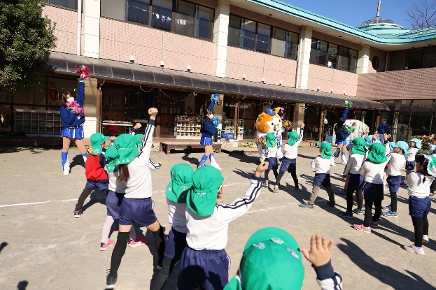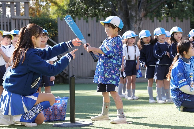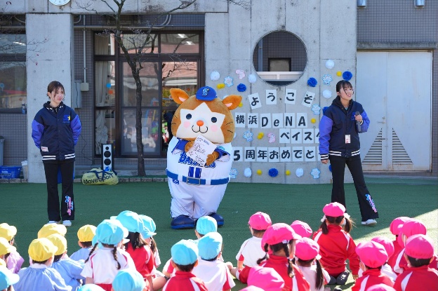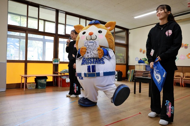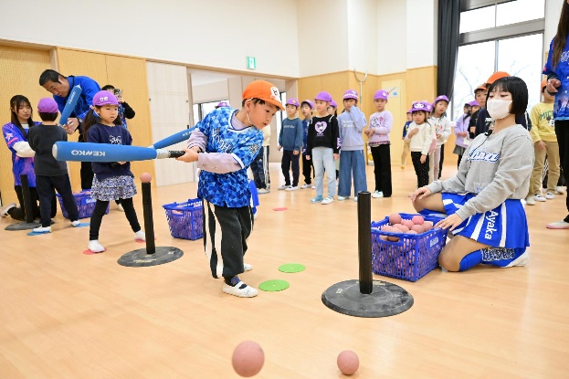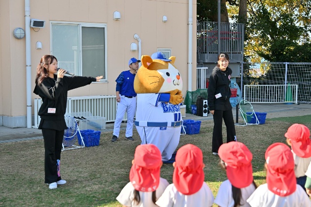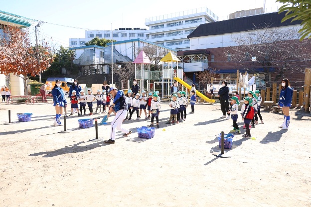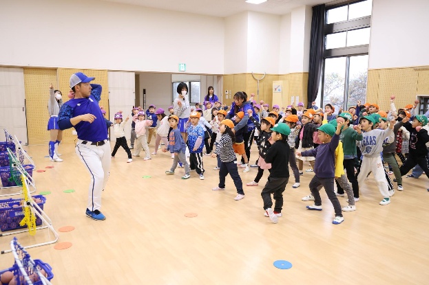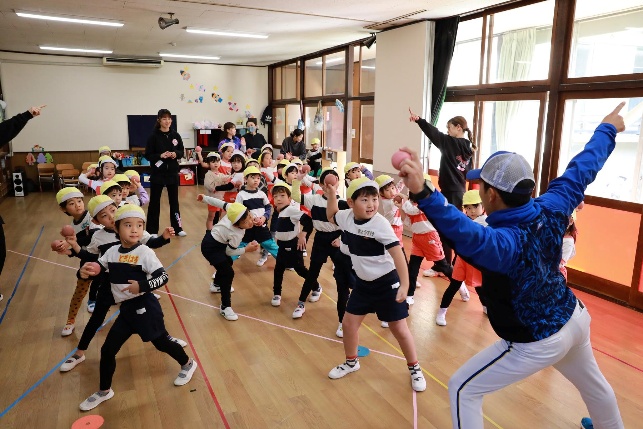 幼稚園や保育園は、小さなこどもたちにボール遊びを経験していただき、野球に興味を持ってもらおうと企画しております。柔らかいボールを使った「捕る・投げる・打つ」のボール遊び以外にもDeNAベイスターズオフィシャルマスコットのDB.スターマンや、オフィシャルパフォーマンスチームdiana(ディアーナ)、チアスクールインストラクターと一緒に、音楽に合わせてダンスエクササイズも行われ、元気いっぱいに身体を動かしました。