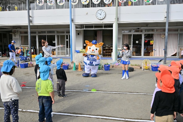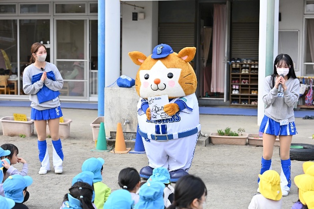 幼稚園や保育園は、小さなこどもたちにボール遊びを経験していただき、野球に興味を持ってもらおうと企画しております。柔らかいボールを使った「捕る・投げる・打つ」のボール遊び以外にもDeNAベイスターズオフィシャルマスコットのDB.スターマンや、オフィシャルパフォーマンスチームdiana(ディアーナ)、チアスクールインストラクターと一緒に、音楽に合わせてダンスエクササイズも行われ、元気いっぱいに身体を動かしました。