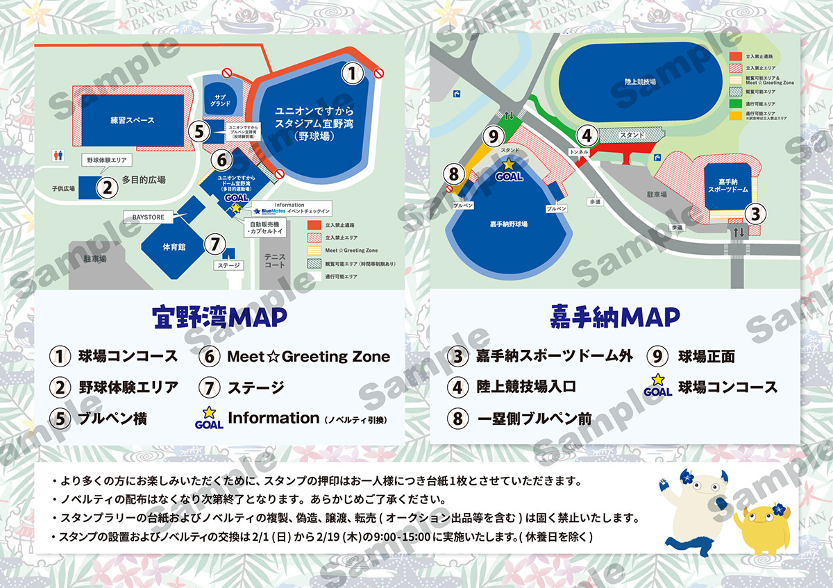 宜野湾:球場コンコース、野球体験エリア、ブルペン横、Meet ☆ Greeting Zone、ステージ、インフォメーション ※2月21日(土)、22日(日)につきましては、球場コンコースではなくインフォメーションにスタンプを設置いたします。ご了承ください。(※1月30日修正) 嘉手納(スタンプ台設置):嘉手納スポーツドーム外、陸上競技場入口、一塁側ブルペン前、球場正面、球場コンコース |