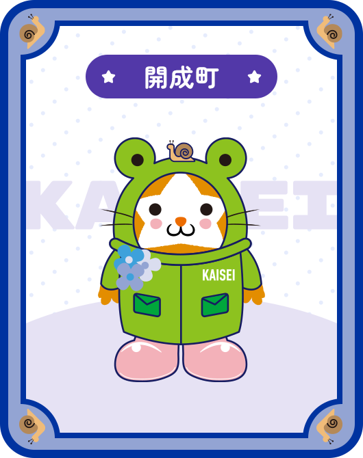 「あじさいが咲く梅雨」がモチーフ。6月には「開成町あじさいまつり」が行われ、「開成ブルー」と呼ばれるオリジナルのあじさいを見ることができます。